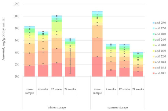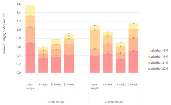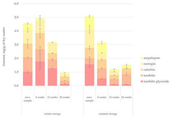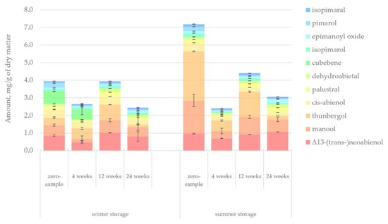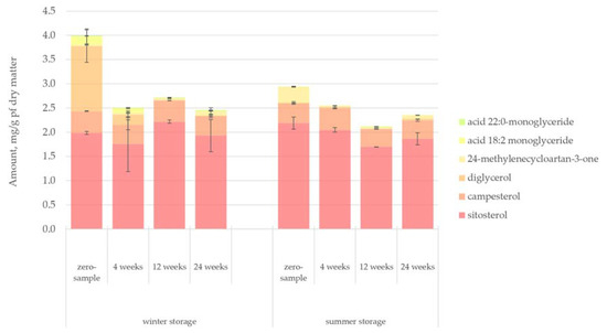 A more in-depth look at the individual compounds’ changes during storage based on extractives groups is given in Figure 6, Figure 7, Figure 8, Figure 9 and Figure 10 for lipophilic extractives and in Figure 11, Figure 12, Figure 13, Figure 14 and Figure 15 for hydrophilic extractives. The exact amounts of the different compounds presented at each figure as well as their standard deviations are presented as Supplementary Files (link to Supplementary Files can be found at the end of the article).