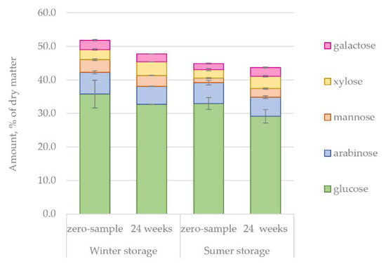 The changes in the hemicellulose content of extractives-free spruce bark during storage were determined by acidic methanolysis. The analysis results presented in Figure 17 indicated similar trends in winter- and summer-stored bark. The relative proportion of the hemicellulose content in extractives-free bark increased gradually during the storage periods. Arabinose and galacturonic acid units were the most abundant units during the winter storage period, corresponding to 6–9% and 6–8% of dry matter, respectively. Arabinose, galacturonic acid (the main component of pectin) and glucose were the most abundant units during the summer storage period, totalling 5–8%, 4–9% and 6–9% of dry matter, respectively. The most noteworthy differences were detected in the amounts of glucose and glucuronic acid. During the summer storage period, the amount of glucose in hemicelluloses increased by 39%, and the amount of glucuronic acid by 62%. This could be seen as the result of cellulose’s degradation as the microbial activity would increase towards the end of the storage period. However, it should be noted that the total amount of glucose in the extractives-free bark decreased during the storage periods (Figure 16) as well as in the water extracts (Figure 5). Correlation with the ambient temperature, increasing towards the end of the winter storage period and at the beginning of the summer storage period, can also be observed (Figure 2).