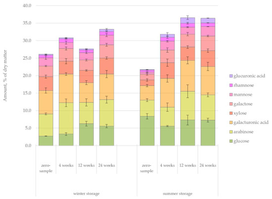 The high-performance anion-exchange chromatography (HPAEC) results of the changes in monosaccharide content during winter and summer storage.