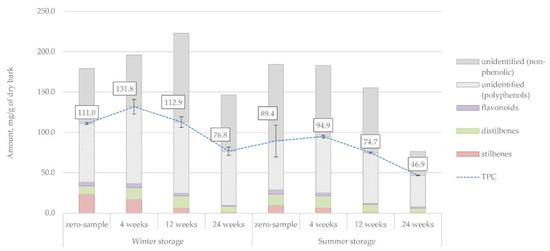 The results indicating the total phenolic content (TPC) of the hot-water extracts, as evaluated with the Folin–Ciocalteu method, are shown in Figure 18. The TPC values are indicated in the figure by a blue dotted line. An overview of the results suggested that the level of TPC was 29% lower during the summer storage period, although the rate of degradation was quite similar in both experiments. The TPC value would presumably also contain the oligomeric and polymeric phenolic compounds. Thus, if the TPC results are compared with the amounts of phenolic compounds from the GC analyses (the columns in Figure 18), an estimate of polyphenols can be obtained. As can be seen, the estimated amount of polyphenols explained approximately 48% of the compounds left unidentified by GC. A large amount of the polyphenolic compounds would most likely contain polyphenols, such as lignin and condensed tannins. A more in-depth HPLC evaluation of the procyanidin content in the inner and outer bark of the same bark material has recently been published [25]. Those HPLC results appeared to be approximately 50% lower than the amounts of polyphenols estimated in Figure 18. This difference in results may be attributed to the presence of lignin and other reducing agents, which also affect the UV reading in the Folin–Ciocalteu method. The unidentified non-phenolic compounds, on the other hand, could contain, for example, polysaccharides.