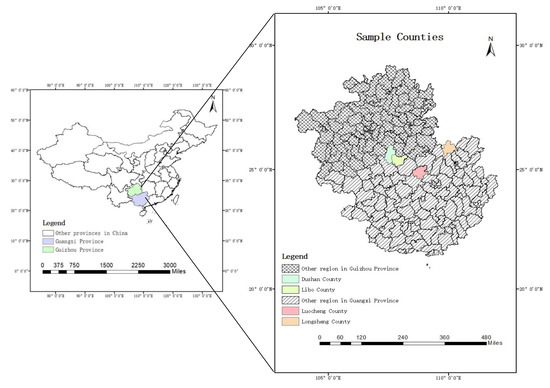 The four sample counties are Longsheng County in Guangxi Province, Luocheng County in Guangxi Province, Dushan County in Guizhou Province, and Libo County in Guizhou Province (Figure 1), all of which are the poor counties designated to acquire pairing-off assistance in poverty alleviation from the National Forestry and Grassland Administration, China. The four counties are all located in the Karst rocky desertification (KRD) region of Southwest China, where the ecology is extremely fragile [24], which is mainly manifested in soil erosion, bare bedrock, as well as decreased soil productivity [25,26].