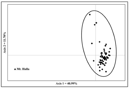 Pairwise FST values ranged from 0.004 to 0.049, and the mean genetic differentiation among populations (FST) was 0.013 (Table S2). Mt. Halla (code 60) had significantly high FST estimates relative to other populations (p < 0.001), as depicted in the PCA scatter diagram (Figure 2). Mt. Halla populations were genetically distant from other populations. Using the Mantel test, significant results were identified among the 60 populations (r = 0.343, p < 0.01, Figure S1), indicating a weak correlation between genetic differentiation and geographic distance.