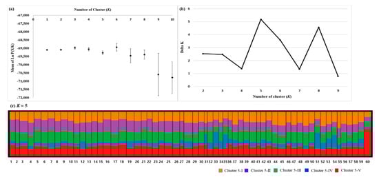 - Pritchard, J.K.; Stephens, M.; Donnelly, P. Inference of Population Structure Using Multilocus Genotype Data. Genetics 2000, 155, 945–959. [Google Scholar] [CrossRef] [PubMed]