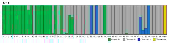 From the Structure analysis, the mean value of Ln P(X/K) was estimated to be similar when K was 1–10, which was found to gradually decrease using the method of Pritchard et al. [35] (Figure 3A). However, the value of ΔK was the highest at K = 5, based on the theory suggested by Evanno et al. [36] (Figure 3B). When K was set at 5, the proportion of the five clusters was visualized in all populations (Figure 3C). Mt. Halla (code 60) was dominant in cluster 5-V. Other populations showed proportions similar to the five clusters. Four clusters were divided from spatially explicit clustering using the Geneland program (Figure 4). The proportion of each cluster within the populations was clearer than that in the Structure analysis. Cluster 4-I was dominant in 22 populations (codes 1–11, 13–18, 20, 22, 25, 26, 38). A high proportion of cluster 4-II was found in 33 populations (codes 12, 19, 21, 23, 24, 27–32, 34, 36, 37, 39–50, 52, 53, 55–59). Four populations (codes 33, 35, 51, 54) were high in proportion to cluster 4-III, and the Mt. Halla population was dominant in cluster 4-IV.