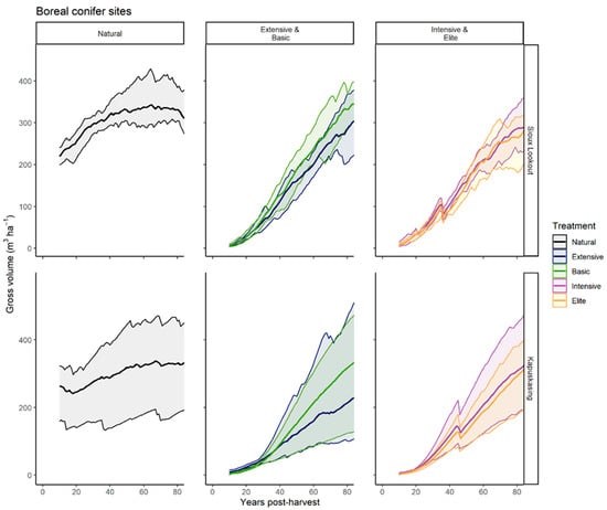 Simulated gross standing volume from the 10th to the 80th year post-harvest for the two boreal conifer sites in the silvicultural intensity study in Ontario, Canada. Lines represent a LOESS (local regression) smooth with a span of four years of gross standing volume for each treatment at each site. Ribbons represent the minimum and maximum gross standing volume at each year, for each treatment, at each site.