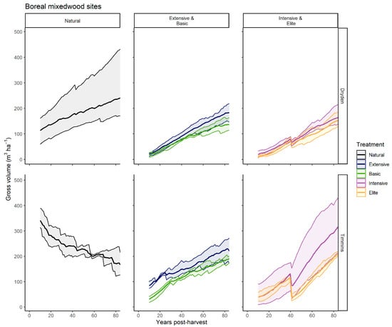 Simulated gross standing volume from the 10th to the 80th year post-harvest for the two boreal mixedwood sites in the silvicultural intensity study in Ontario, Canada. Lines represent the average gross standing volume of each treatment at each site. Ribbons represent the minimum and maximum gross standing volume at each year, for each treatment, at each site.