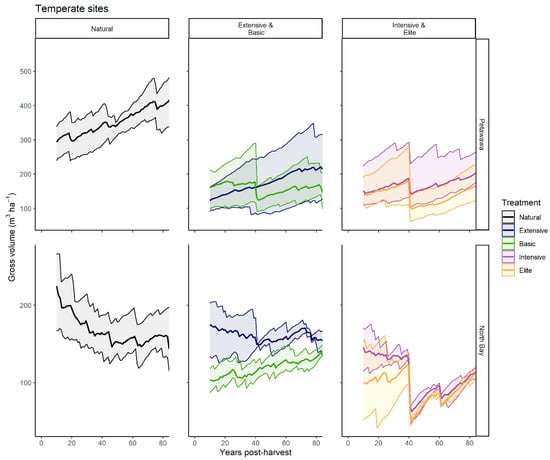 Simulated gross standing volume from the 10th to the 80th year post-harvest for the two temperate sites in the silvicultural intensity study in Ontario, Canada. Lines represent a LOESS smooth with a span of four years of gross standing volume of each treatment at each site. Ribbons represent the minimum and maximum gross standing volume at each year, for each treatment, at each site.