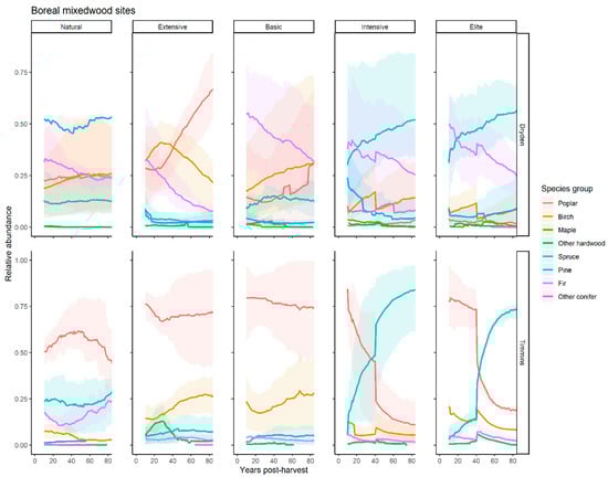 Relative abundance by species group from the 10th to the 80th year post-harvest for the two boreal mixedwood sites in the silvicultural intensity study in Ontario, Canada. Lines represent a LOESS smooth with a span of four years the relative abundance of each species for each treatment at each site. Ribbons represent the minimum and maximum relative abundance of each species at each year, for each treatment, at each site; ribbons disappear when only one experimental unit contains a species group.