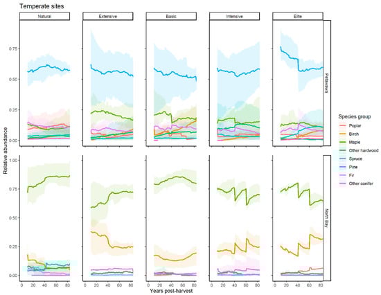 Relative abundance by species group from the 10th to the 80th year post-harvest for the two temperate sites in the silvicultural intensity study in Ontario, Canada. Lines represent a LOESS smooth with a span of four years the relative abundance of each species for each treatment at each site. Ribbons represent the minimum and maximum relative abundance of each species at each year, for each treatment, at each site; ribbons disappear when only one experimental unit contains a species group.
