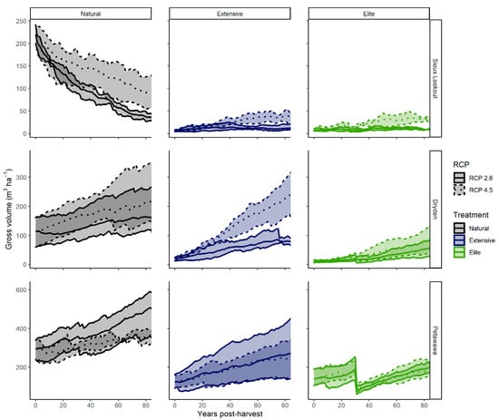 Simulated gross standing volume from the 10th to the 80th year post-harvest for the three selected sites in the silvicultural intensity study in Ontario, Canada, including climate forcing. Lines represent a LOESS smooth with a span of four years of gross standing volume of each treatment at each site. Ribbons represent the minimum and maximum gross standing volume at each year, for each treatment, at each site. Climate forcings followed Relative Concentration Pathways 2.6 (low) and 4.5 (moderate) climate change scenarios. Line type represents the two climate scenarios. Basic and Intensive treatments are omitted for readability.