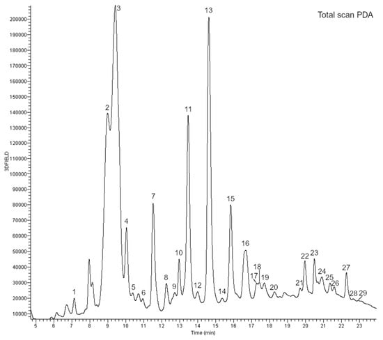 | Peak Number | λ (nm) | [M + H]+ * or [M-H]− (m/z) | MS2 (m/z) | |