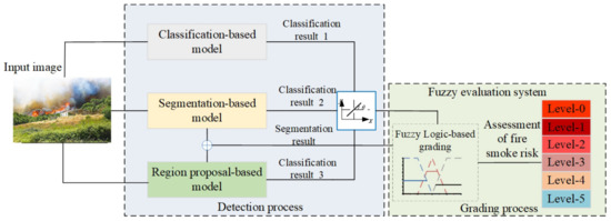 The experimental results showed that multi models can improve the performance of our algorithm in terms of the detection accuracy and segmentation accuracy. We synthetically utilized three values: the classification result, the segmentation region, and the location. These were fed into our designed fuzzy evaluation system to obtain the forest fire smoke level, which could help humans to take proper precautionary measures in a timely manner.
