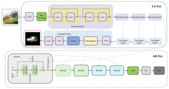 Table 2 shows the structure of AD-Net. In this study, an attention mask is introduced into the residual branch of a residual spatial attention model (RSAM) to focus more attention on heavily weighted regions, as shown in Figure 2. The RSAM modules utilize the results of LS-Net as an attention mask to cause AD-Net to focus more on small object regions from the segmentation results. The number of RSAM modules is increased from 1 to 5 to enhance the contrast between fire and non-fire regions. In Figure 2, AD-Net includes 5 RSAM modules, 1 global average pooling layer (RRS) and 1 fully connected layer. As in LS-Net, batch normalization and ReLU are used. This pooling layer squeezes the spatial dimensions and extracts abstract semantic information. Because the output features only depend on the channel of the input feature for this pooling layer, a fixed input image size is unnecessary. The fully connected layer with a sigmoid activation function takes the output of this pooling layer as the input and predicts the probability that an object exists in an image.