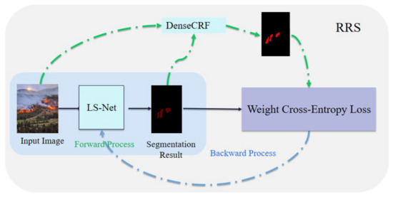 The region detection (segmentation result) using LS-Net only identifies the rough regions of fire and smoke. Furthermore, the fine segmentation results are implemented on the RRS algorithm, which is proposed to fine-tune LS-Net. This can be regarded as an iterative energy minimization method like GrubCut [43]. We build a DenseCRF on LS-Net, and based on these methods, we formulate an energy minimization problem to estimate the latent pixel labels, which are called pseudo-pixel labels. We consider these as the supervision to fine-tune LS-Net with a small learning rate. RRS alternates between estimating pseudo-pixel labels and using them to optimize LS-Net. In other words, DenseCRF improves the segmentation results, and RRS training can be seen as a self-evolution process of LS-Net, as shown in Figure 3.