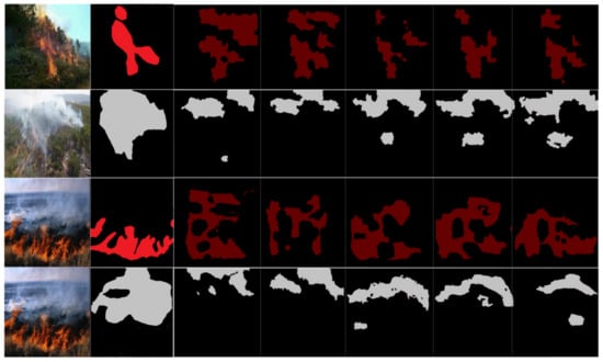 The accurate and timely recognition of the region of forest fire smoke is an important task in preventing forest disasters and protecting the environment. To address this issue, many researchers have developed various techniques, such as wireless network sensors and satellite systems [8,10,28], robotic systems [29], intelligent techniques [30], and image processing techniques [11,12,13,14]. Due to the factors of deployment, utilization convenience of use, and a high detection rate, the image techniques have been used widely and have attracted the attention of many researchers, as they are more suitable for forest fire detection. Nevertheless, there are some limitations of the traditional image technologies that are used in real-world applications [11,12,13,14]. Recently, DL-based methods have become a mainstream technology for intelligent fire detection based on vision [23,31,32,33,34,35].