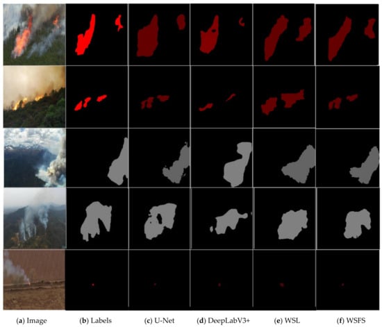 Table 5 shows that the performance of region detection for DeepLabe V3+ is the worst of the tested methods and 67.4% in mIOU. The WSL methods achieve at 60.5% in mIOU. A small improvement of 8.3% is obtained by WSFS, due to RRS adopted by this method. However, the best performance of region detection, which reaches 70.2% in mIOU, is achieved by FireDGWF because the intersection between the detection regions obtained with the two methods (WSFS and lightweight Faster R-CNN) corresponds to the results.