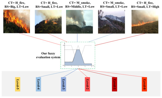To evaluate forest fire severity, we designed a 3-input/1-output fuzzy evaluation system. These 3-inputs included the classification results, the segmentation region size, and the location. The single output was the forest fire smoke level: level 0, level 1, …, level 5. In our fuzzy evaluation system, the membership function must be decided first, which is similar to our previous work [58,59]. Once the membership degree of every input has been determined, a set of rules, which are defined in the system, as shown in Table 6, can be used to explain the evaluation results. Then, the detailed procedure for the example using the fuzzy evaluation system to grade the forest fire smoke level can be provided.