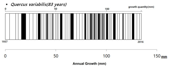 Tree age and growth of the Quercus serrata sample tree in fixed survey plot no. 7 in the forest of the Changdeokgung Rear Garden. Black line in the figure shows the annual rings of the late wood.