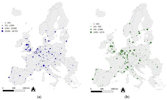 This study targets 678 core areas of the Functional Urban Areas (FUAs) located in 31 European countries (i.e., EU27 and EFTA countries, and including the United Kingdom), the boundaries of which have been delineated according to the classification system of urban centers provided by the OECD []. We considered only the core areas of the FUA, in order to exclude large non-urban vegetated areas that are frequently included within the whole FUA areas. Adjacent core areas were counted as a single unit. Hereafter, the term cities is used to refer to core areas.