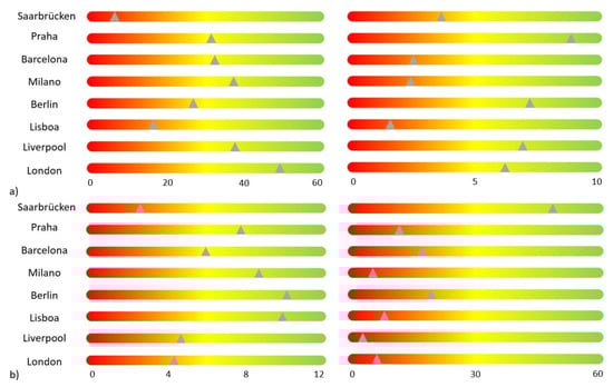 A series of GIS processing operations were then performed to scale down the data relatively to each city and allow a series of descriptive statistics at the city level or the EU country level (see Supplementary Material S1). These latter were performed through R software [] and Microsoft Excel (for spectrum charts and box-plots).