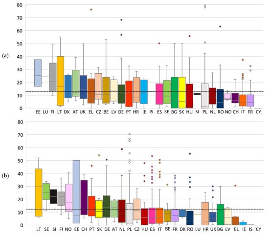 Relative values (%) of observations in green areas (a) and forests (b). The black line indicates the European average. Relative values were calculated as a percentage ratio between the total number of observations in green areas (a) and forests (b) and the total number of observations within the city. The lines within box plots indicate the median value. The color is unique for each country so that it is possible to compare different values of observations for the same country respectively for green areas and forests. Full country name and related abbreviation as reported in the figure: Austria (AT); Belgium (BE); Bulgaria (BG); Croatia (HR); Cyprus (CY); Czech Republic (CZ); Denmark (DK); Estonia (EE); Finland (FI); France (FR); Germany (DE); Greece (EL); Hungary (HU); Iceland (IS); Ireland (IE); Italy (IT); Latvia (LV); Lithuania (LT); Luxembourg (LU); Netherlands (NL); Norway (NO); Poland (PL); Portugal (PT); Romania (RO); Slovakia (SK); Slovenia (SI); Spain (ES); Sweden (SE); Switzerland (CH); United Kingdom (UK).