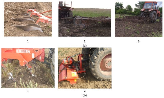 Description of the equipment used in the traditional (a) and minimal (b) seedbed tillage systems. Legend: (a)—traditional seedbed tillage system: 1—plow, 2—disk harrow, 3—cultivator; (b)—minimal seedbed tillage system: 1—scarifier, 2—rototiller.