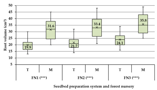 Descriptive statistics and results of the statistical comparison of root’s volume at the forest nursery level. Legend: T—traditional seedbed tillage system, M—minimal seedbed tillage system, FN1—forest nursery of Iarac, FN2—forest nursery of Agrişul Mare, FN3—forest nursery of Iosăşel. Note: diagnose indicated by *** stands for p values less than 0.001.