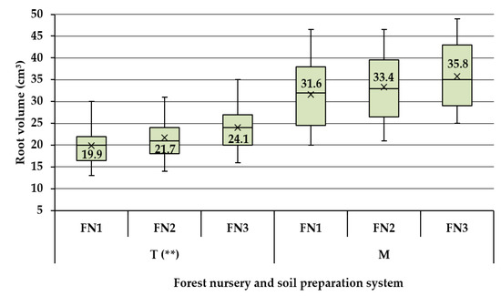 Results of the ANOVA test done on the data characterizing the M seedbed tillage system have indicated no significant statistical differences in terms of root volume as potentially induced by the specificity of the three nurseries taken into study (Figure 4). Given these statistical outcomes, no further statistical tests were carried out to compare potential pairwise differences between the root volumes as outcomes specific to each of the three forest nurseries. Nevertheless, it is worth to mention that there were differences in size which accounted for ca. 5.6% between FN2 and FN1, 13.3% between FN3 and FN1 and 7.2% between FN3 and FN2. The situation was different in the case of T seedbed tillage system, because the results of ANOVA test proved to be significant, indicating therefore differences in terms of root volume as an effect of the forest nursery taken into study. In this case, the percentual differences, in the same order as given before, accounted for ca. 9, 21 and 9%, respectively.
