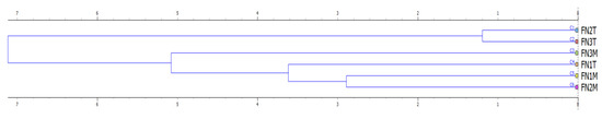 Similar results (Figure 6b and Figure 7) were found when using the root volume variable as a target for hierarchical clustering, with the difference that this approach has excluded the effect of species since the data was available only for the pedunculate oak. Excepting the case of FN3M, all the silhouette values were found to range between ca. 0.6 and 0.9 indicating, therefore a good outcome of clustering in terms of cohesion. The placement of FN1T among the group of M treatments could be the effect of data similarity (low differences) in terms of soil physical properties for the FN1 (Table A3). To conclude, the main variable contributing to the similarity of outcomes in terms of seedling growth was the type of seedbed tillage system. As such, hierarchical clustering has shown that the outcomes are similar in terms of growth variables when treated under the same type of seedbed tillage system. However, there were some dissimilarities which were brought, for instance, by the low differences in growth (Norway spruce).