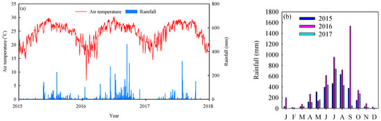 The mean (a) daily air temperature, soil moisture, rainfall and (b) monthly rainfall from 2015 to 2017.