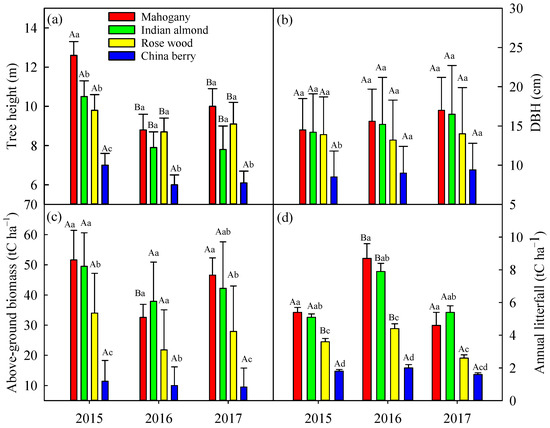 Interannual variations in (a) tree height, (b) DBH, (c) aboveground biomass, and (d) annual litterfall from 2015 to 2017 for different tree species: mahogany (Swietenia macrophylla King, red bar), Indian almond (Terminalia catappa Linn., green bar), rose wood (Pterocarpus indicus Willd., yellow bar), and China berry (Melia azedarach Linn., blue bar). Different capital letters indicate differences among years for the same species at p < 0.05. Different lowercase letters indicate differences among species within the same years at p < 0.05. Error bars indicate standard deviations (n = 4).