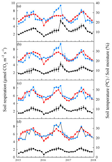 Monthly variations in soil respiration (μmol m−2 s−1), soil temperature (°C) and soil moisture from 2015 to 2017 for the different tree species: (a) mahogany, (b) Indian almond, (c) rose wood, and (d) China berry. The black, red, and blue solid circles represent the soil respiration, soil temperature, and soil moisture, respectively; error bars represent standard deviations (n = 4).