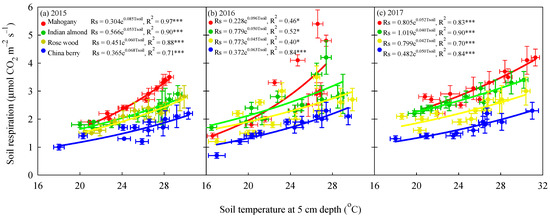 Relationships between monthly mean soil respiration (Rs, μmol CO2 m−2 s−1) and soil temperature at a 5 cm depth (°C) for studied tree species in (a) 2015 (b) 2016, and (c) 2017. Asterisks indicate a significance: * p < 0.05, *** p < 0.001. Values are presented as the mean ± standard errors, n = 4.