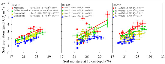 Relationships between monthly mean soil respiration (Rs, μmol CO2 m−2 s−1) and volumetric soil moisture at a 10 cm depth (%) for studied tree species in (a) 2015, (b) 2016, and (c) 2017. Asterisks indicate a significance: * p < 0.05, ** p ≤ 0.01, *** p < 0.001. Values are presented as the mean ± standard errors, n = 4.