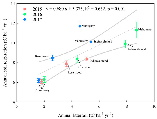 Significant relationships between the annual litterfall and annual Rs were observed for the four tree species from 2015 to 2017 (R2 = 0.65, p = 0.001, Figure 6). On the other hand, the annual Rs for mahogany in 2017 was outside the 95% prediction interval and was higher than the values estimated from the annual litterfall–annual Rs relationship (Figure 6).