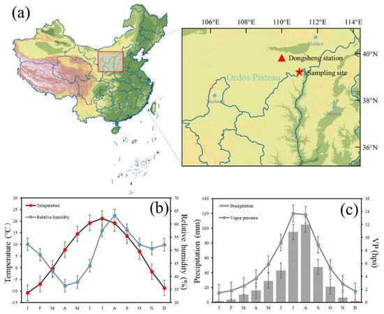 (a) Location of the study site and the nearest meteorological station (Dongsheng station). (b) Monthly distributions of temperature and relative humidity and (c) precipitation and VP at Dongsheng meteorological station from 1957 to 2012.