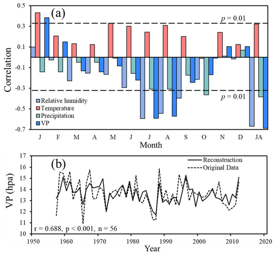 (a) Correlations between tree-ring δ18O chronology and climatic factors (including relative humidity, temperature, precipitation, and VP). JA represents the period from July to August. (b) Comparison between reconstructed and observed July to August VP.