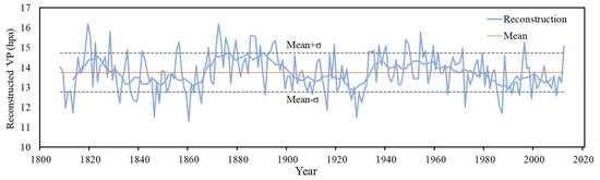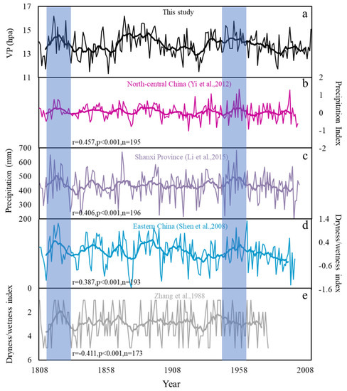 We compared our reconstructions with several other hydroclimatic reconstructions and found that they were significantly correlated on long time scales and showed the same long-term trends (Figure 5). For example, the reconstructed precipitation series in North China [50] showed a significant positive correlation with our reconstructions (r = 0.457, p < 0.001, and N = 195). The long-term variations in precipitation sequences in Shanxi region were consistent with our reconstruction (r = 0.406, p < 0.001, and N = 196) [33]. Moreover, our reconstructions were significantly correlated with the regional dry–wet index of the North China Plain (r = 0.387, p < 0.001, and N = 193) [41]. The results showed that the reconstructed sequences were significantly negatively correlated with the adjacent dry–wet sequences based on historical literature reconstruction (r = −0.411, p < 0.001, and N = 173) [51]. The negative correlation is obtained because high VP represented a wet climate period, and a large index of the wet–dry series denotes a drought period. Among all the time series, two periods of high VP are similar: which were 1820s and 1950s. Since the 1950s, all the series have shown a decreasing trend (Figure 5).