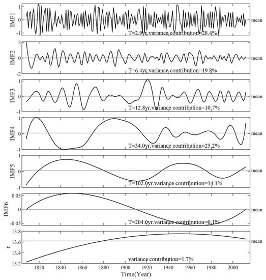 Results of the EEMD of VPJA reconstruction. The periodicities and variance contributions are demonstrated. IMF represents intrinsic mode function.