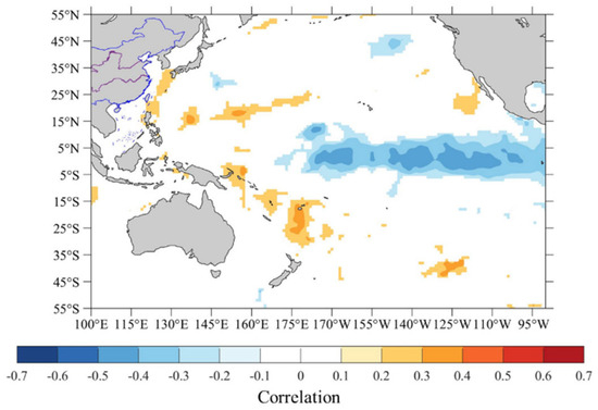 We used the EEMD method to decompose the reconstructed VPJA series into six IMFs and a residual trend (Figure 6), with unique characteristics reflecting fluctuations and trends on different time scales [31,52]. Among them, IMF1 and IMF2 cycles are in the range of 2–7 years, which is consistent with the El Niño–Southern Oscillation (ENSO) cycle [53,54]. The spatial correlation analysis between the IMF1 and IMF2 mean periods and sea surface temperatures (SSTs) (Figure 7) showed a significant negative correlation, suggesting a possible correlation between VP variations in the Ordos region and ENSO. Studies have shown that ENSO affects precipitation in the monsoon region through air–sea coupling [55]. Ordos is at the edge of the East Asian summer monsoon. ENSO strongly influences the East Asian monsoon, and thus, changes water resource availability [54]. Li et al. (2011) were the first researchers to find a strong correlation between stable δ18O and equatorial central-eastern Pacific SSTs in northern China tree rings [56]. The following mechanism may be used for this phenomenon: anomalous walker circulation in the EI Nino/La Nina years influenced the position of the northwest Pacific subsurface and changed the direction of the water vapour source [56]. According to the results of previous studies and our study, the effect of central Pacific SSTs on the climate of Ordos can gradually increase, further intensifying the drought.