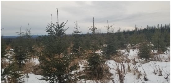 - Lieffers, V.J.; Sidders, D.; Keddy, T.; Solarik, K.A.; Blenis, P. A partial deciduous canopy, coupled with site preparation, produces excellent growth of planted white spruce. Can. J. For. Res. 2018, 49, 270–280. [Google Scholar] [CrossRef]