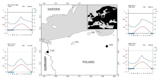 Locations of Douglas fir stands and climatic diagrams. Plots of the precipitation and temperature monthly averages, annual averages of both elements (in the upper part) and monthly averages of the daily maximum and minimum temperatures of the warmest and coldest months, respectively (at the left margin); blue rectangle under the 0 °C axis—frost likelihood; JAM—Jamy, LEB—Lębork, CZA—Czaplinek and CHO—Chojna.