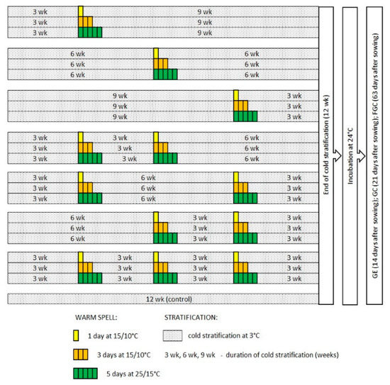 Schematic of treatments to examine the interruption of cold stratification by warm spells differing across time (week 3, 6 and/or 9), in lengths (1, 3 and 5 days) and in temperatures (15/10 °C and 25/15 °C). GE—germination energy; GC—germination capacity; FGC—final germination capacity; wk—duration of cold stratification (weeks). Concept of figure based on Flanigan et al. [10].