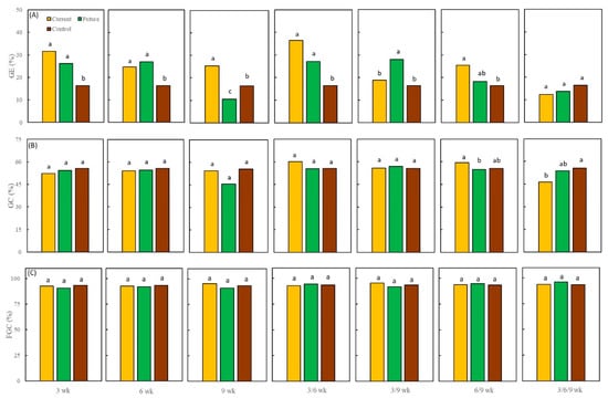 We found significant influence for all analyzed model effects (except P × D interaction) on GE, GC (except P × D interaction) and FGC (except for the effect of week of stratification (W) and the effects of P × D and P × W interactions). For the sake of better understanding and to make the manuscript more readable, we decided to move all analysis results regarding the significance of all model effects and their interactions to the Supplementary Materials section. In the case of GE and GC, significant differences were found for P × W (Tables S1–S3), D × W (Tables S1–S3) and P × D × W interactions (Figures S1–S3). However, in the case of FGC we only found significant differences for D × W (Tables S1–S3) and P × D × W (Figures S1–S3).