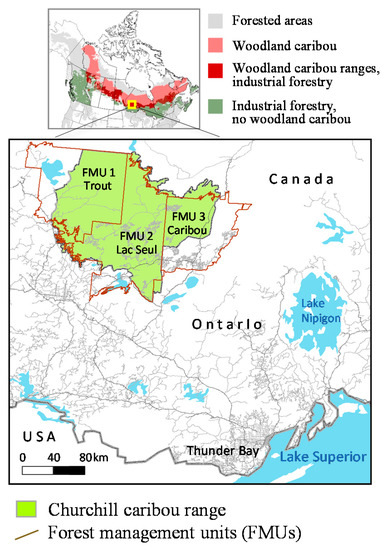 We applied models 1–7 to assess whole-range habitat protection options in the Churchill caribou range in northwestern Ontario [71,72] (Figure 1). The area is adjacent to Wabakimi Provincial Park and includes three forest management units (Trout Lake Forest, Lac Seul Forest, and Caribou Forest) that all experience moderate levels of industrial harvesting. Each FMU is licensed to a major timber company: Trout Lake Forest to Domtar Pulp and Paper Products Inc. (Montreal, QC, Canada), Lac Seul Forest to Ondaadiziwin Forest Management Inc. (Hudson, ON, Canada), and Caribou Forest to Resolute Forest Products Inc. (Montreal, QC, Canada), with timber delivered to pulp and paper mills in the nearby cities of Thunder Bay and Dryden, ON.