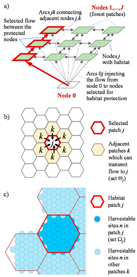 (a) The network flow model concept. Arrows show the universe of arcs, or connections, in the habitat network. Dashed arrows show connections from the root node 0 to nodes j in the network. Root node 0 is used to inject the flow into the network. Arrows in bold red show examples of connected nodes with established flow from root node 0; (b) The concept of an adjacency set Θj around a selected node j; (c) Spatial alignment between the sets of harvestable sites n and habitat patches j. Set Ωj depicts harvestable sites n located in habitat patch j. The selection of habitat patch j for protection forbids harvesting all sites n that belong to set Ωj.