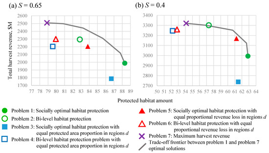 Trade-offs between problem 1–7 optimal solutions in dimensions of total harvest revenue and the amount of protected habitat in the range area: (a) optimal solutions for the protected habitat target S = 0.65; (b) optimal solutions for S = 0.4. The protected habitat amount is depicted as the dimensionless scores.