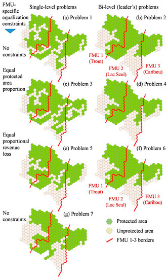 Adding the equal protected area constraint in problems 3 and 4 moderately changed the patterns of protected patches, yet their general configurations of protected patches resembled the configurations in problems 1 and 2 (Figure 5c,d and Figure 6c,d). Similar changes were observed for the problem 5 and 6 solutions that enforced equal proportional revenue loss among the FMUs. The general strategy was to protect areas of prime habitat in the central part of the range and near the northern borders while increasing harvest intensity in the southern and western parts, where there are high densities of permanent roads.