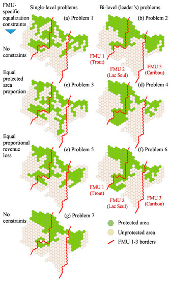 Our study illustrates some advantages of a bi-level, game-theoretic approach. Our socially optimal problem 1 implies that the regulator is able and willing to allocate protected areas down to the patch level to maximize its habitat protection utility. The problem’s optimal solution achieves the maximum habitat protection utility, but as a practical matter, a problem 1 formulation is unlikely to be adopted because it ignores the interests of forestry companies operating in the area of concern. An opposite approach is depicted in problem 7. The objective maximizes the sum of the revenues for all companies subject to the protection area target set by the regulator. This scenario provides an upper bound for the best achievable sum of the companies’ profits but is unlikely to be adopted by the regulator due to its weak capacity to protect high-quality caribou habitat. Moreover, the solution that maximizes aggregate revenue may not be perceived as fair if the burden of achieving the target level of habitat protection falls within one FMU. The bi-level scenarios, as depicted by problems 2, 4, and 6 may be a better option because they assume that the regulator knows the utility preferences of the companies and endogenizes their decisions concerning their preferences. Note that socially optimal problem solutions showed lower harvest revenue than the bi-level problem solutions (Table 4). This is because the bi-level solutions anticipate the profit-maximizing strategy of the forestry companies within their FMUs and produce a more cost-effective harvest plan. The bi-level problem also sets fewer constraints on harvesting within FMUs. It allows timber companies to choose the forest patches to protect to meet the assigned target while maximizing harvest revenue.