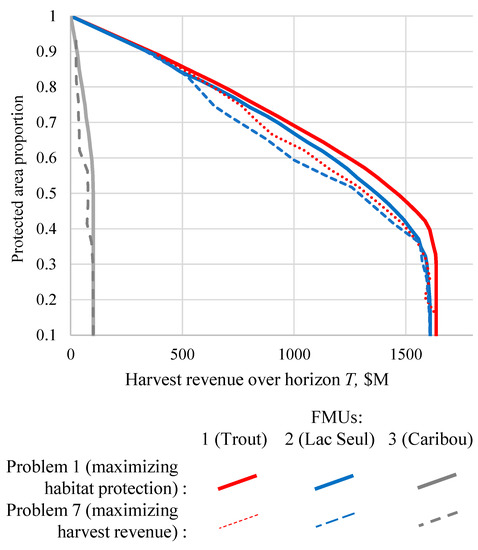The proportion of protected habitat area exempt from harvest in the FMU area vs. total harvest revenue for FMUs 1–3. The curves show the solutions for problems 1 and 7, which represent the endpoints of the trade-off frontier (see Figure 4) between solutions that maximize the amount of protected habitat (Problem 1; solid lines) and solutions that maximize harvest revenue (Problem 7; dotted/dashed lines).